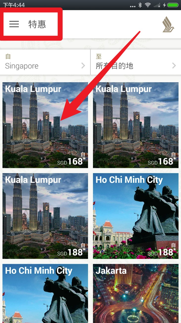 2、进入“特惠”页面可查看新加坡航空的最新折扣航线与价格信息,图文展示清晰明了。