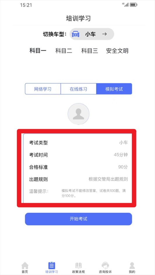 3. 点击“培训学习”页,可进入科目一至科目三及安全文明考试的练习与模拟考试模組。