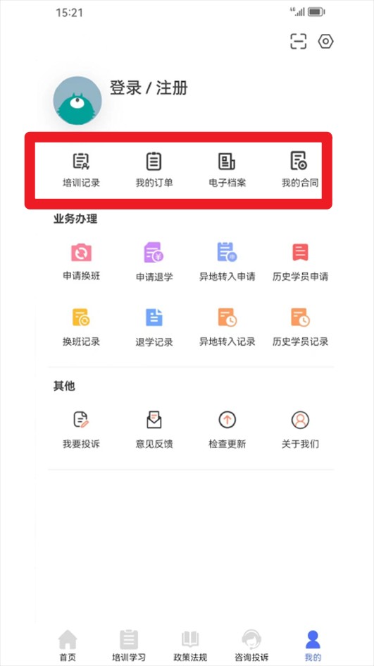 4. 在“我的”页面可查看培训记录、电子档案、合約及订单,并支援在线提交退学/换班申请等业务。