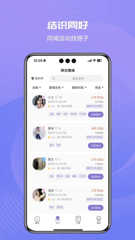1、通过精准定位,智能推荐附近的运动教练,便于选择适合的教练跟练运动。