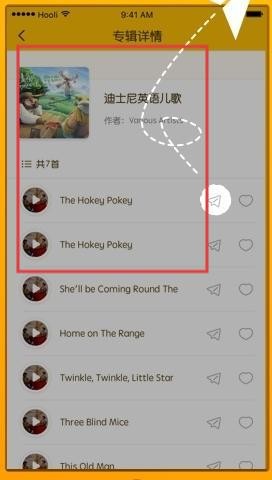 1、展示专辑详情,可查看专辑封面、名称、作者及包含的歌曲列表,支持播放、分享。