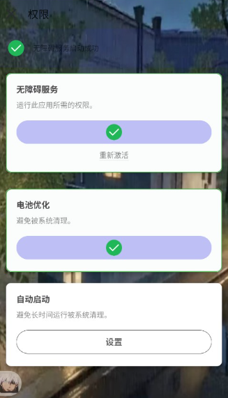 1、:权限就绪。进入应用后按引导依次开启悬浮窗与辅助服务;未授权将无法正常点击。