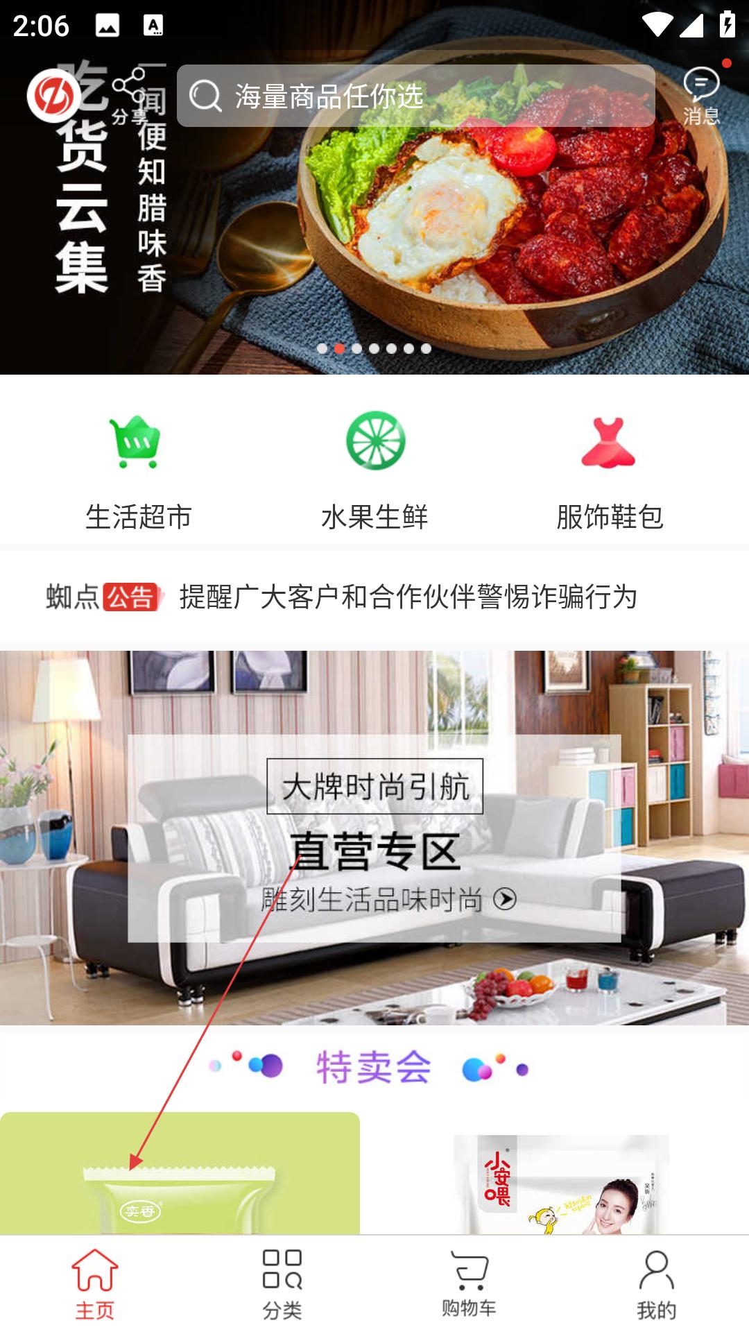 3、页有搜索栏、吃货云集,还有生活超市、水果生鲜等分类入口,及公告、直营专区、特卖会等板块,方便浏览购物。