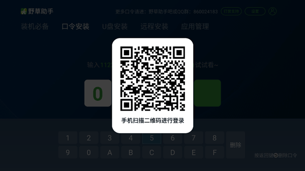 1、手机上的野草助手app扫码电视上的app登录二维码。