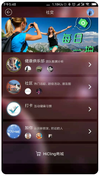 cling应用程序记录并存储用户的心跳、体温、运动、睡眠等数据。由cling智能手表通过与cling智能手表同步来收集。这样,用户可以查看和分析所有的数据,帮助用户更好地了解自己。同时,cling会根据每个用户不同的作息时间,智能生成相应的健身方案,帮助用户改善健康,引领用户走向健康生活。此外,cling为用户提供了一个社交网络,让所有用户可以互相认识,分享和交流健康生活。