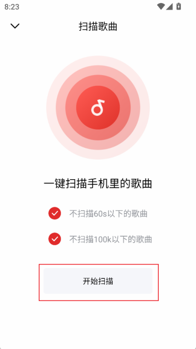 4、点击后进入扫描歌曲界面,在这里可以一键扫描手机里的歌曲,点击下方的【开始扫描】,最后将扫描出来的歌曲导入进来即可。