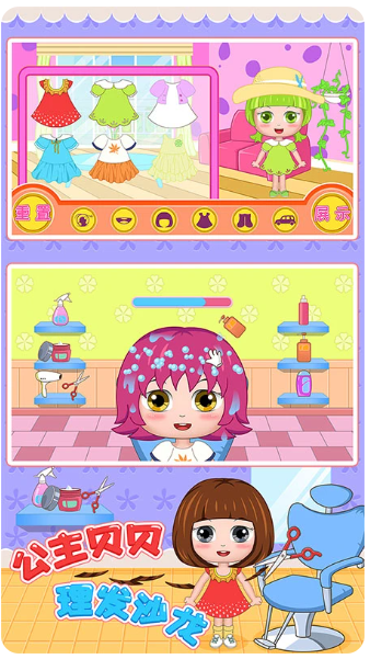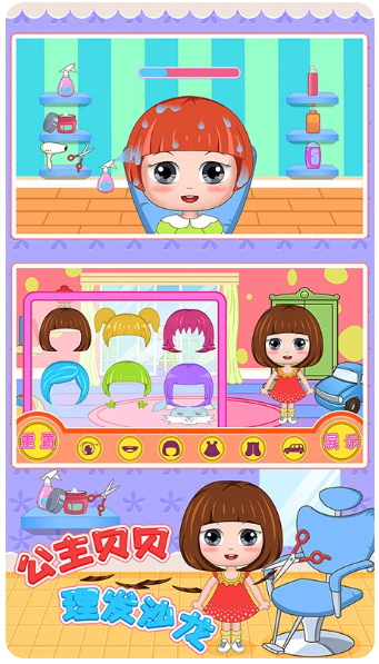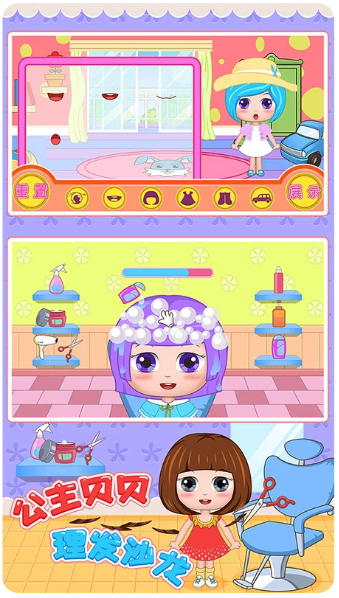 2、洗头、染发和剪头发,为公主贝贝提供一个舒服的头发护理。