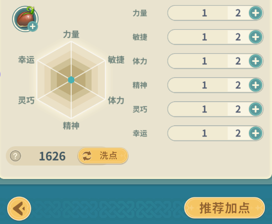 分为力量、敏捷、体力、精神、灵巧、幸运,每种属性对应不同的作用,可以根据伙伴特点进行点数分配。