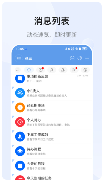 3、统一待办中心:支持将企业ERP、CRM、OA等各类系统待办统一在一个待办中心,并以消息的形式推送给用户,让用户在一个窗口处理所有的待办事项。