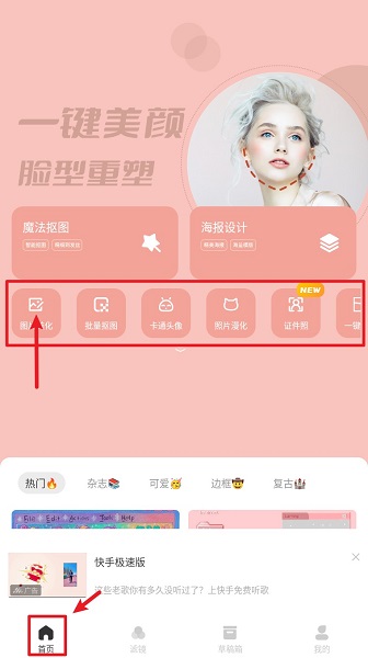 4、返回首页后选择下方“首页”导航栏,进入功能主界面浏览各类编辑选项。