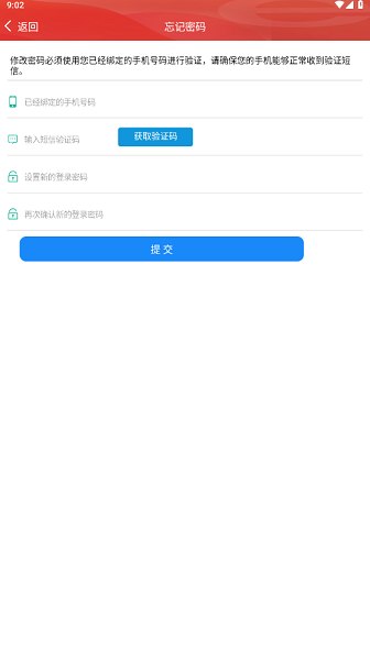 2、输入手机号填写验证码重新设置新密码即可。