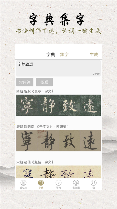 2、书法临摹:配备大量高清石碑临摹资源,支持缩放、描摹和双屏比较临摹模式。