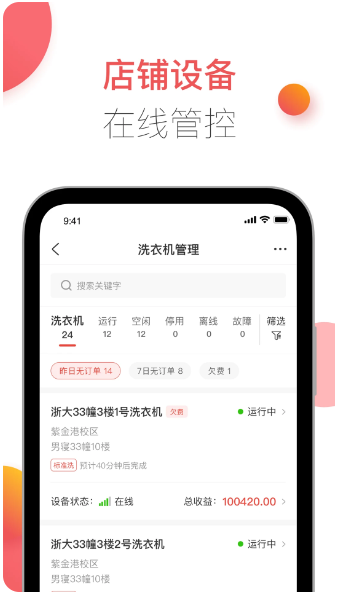 2、店铺设备,查看管理自己的店铺,统计好所有设备、信息和工作状态。