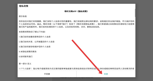 1、畅听无碍启动时弹出隐私政策页面,阐述信息处理方式,需点击同意接受条款才能继续使用APP。