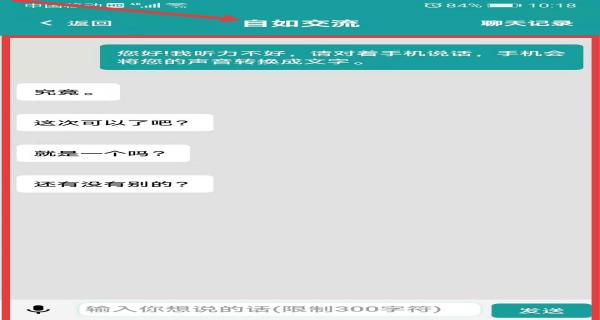 3、畅听无碍的自如交流界面,支持语音转文字交流,方便听力不佳者沟通,可输入300字内文字。
