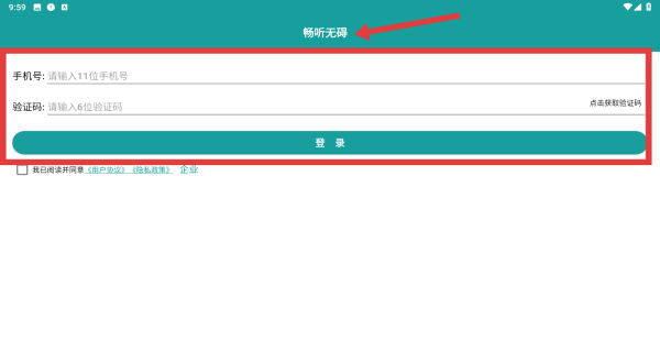 2、畅听无碍登录页面,设有手机号和验证码输入框,需输入对应信息,勾选协议后点击登录完成登录。