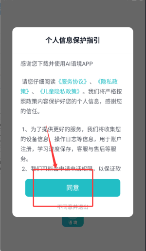 1、 轻触同意协议后,即可顺利进入AI语境应用,开启个性化英语学习之旅,为接下来的学习做好充分准备。