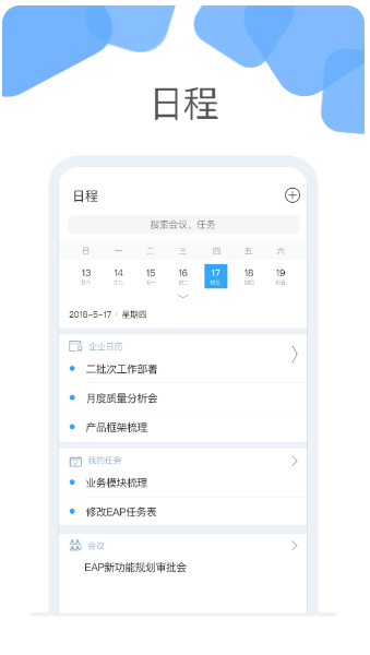 1、事项一目了然:整合会议、企业日历、待办事项、智能通知功能,汇集眼前和最近的事项,整理工作。
