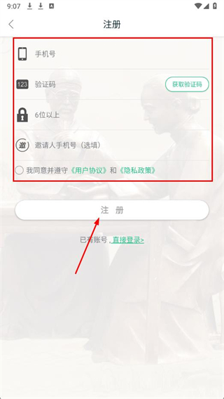 2、输入手机号、验证码,设置密码,填写邀请人手机号,勾选用户协议和隐私政策,点击注册。