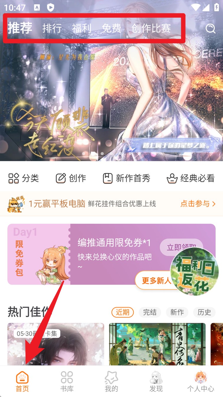 1、进入App后默认停留在“首页”标签,这里可以浏览推荐、排行榜、免费内容与创作比赛,顶部菜单栏支持快速切换。
