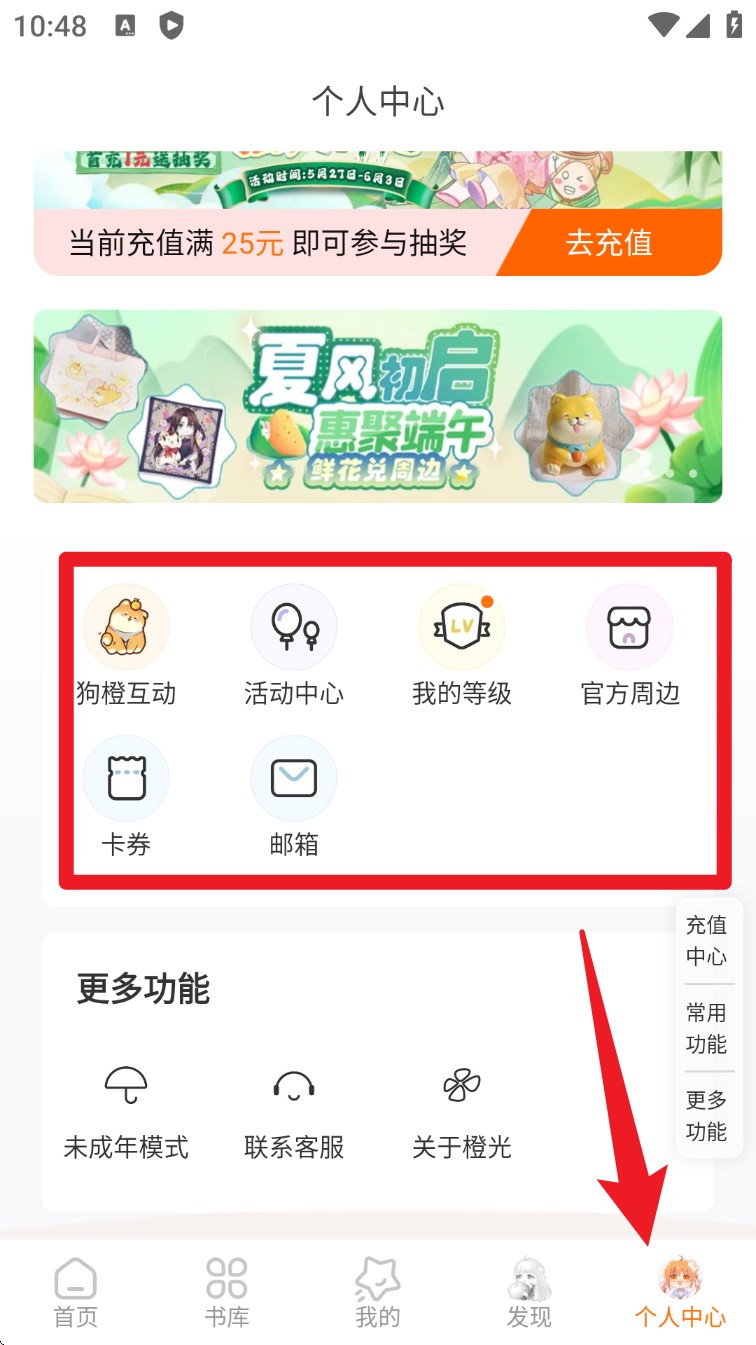 5、进入“个人中心”,可管理等级、卡券、活动记录等功能,还能访问狗橙互动和官方周边专区。