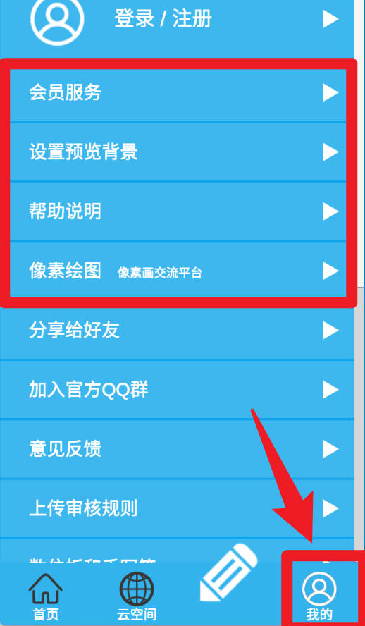 5、在我的页面,可以进入会员服务、帮助说明、背景设置等功能区,还能加入像素绘画交流平台与其他爱好者互动。