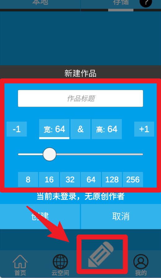 4、点击底部画笔图标新建作品,输入标题并设置画布宽高与像素大小,即可开始全新绘制。
