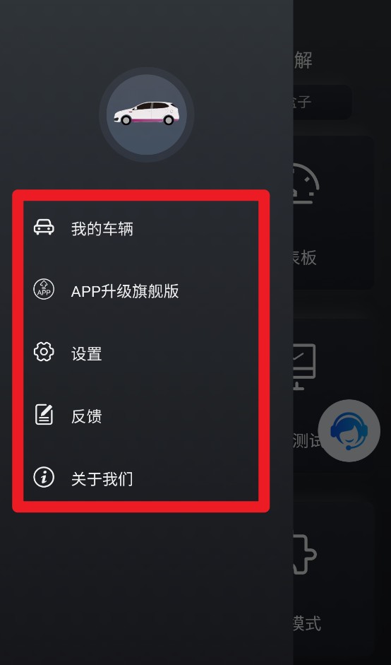 4、侧边栏可进入“我的车辆”管理、升级旗舰版、设置选项、反馈提交以及查看关于我们等内容。