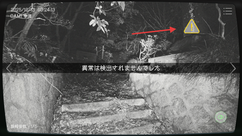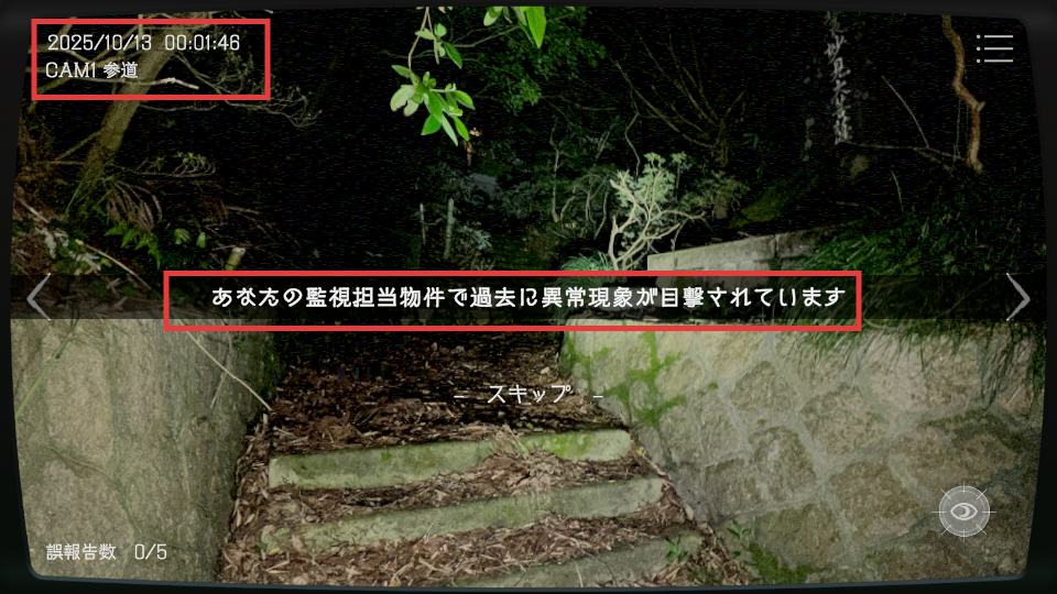 2、监控【CAM1-参道】画面,留意时间变化,依据提示关注过往异常现象线索。