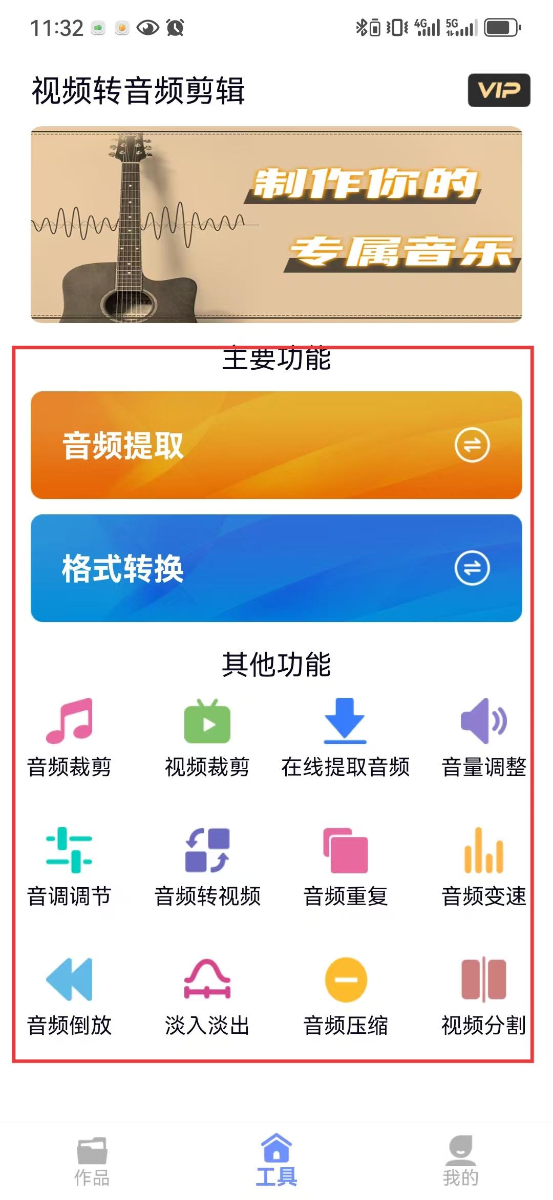 1、进入工具页面找到视频转音频剪辑功能,利用音频提取导入视频可提取出音频,格式转换能改变音视频文件格式,还有音频裁剪、视频裁剪等工具,用户根据需求选择。