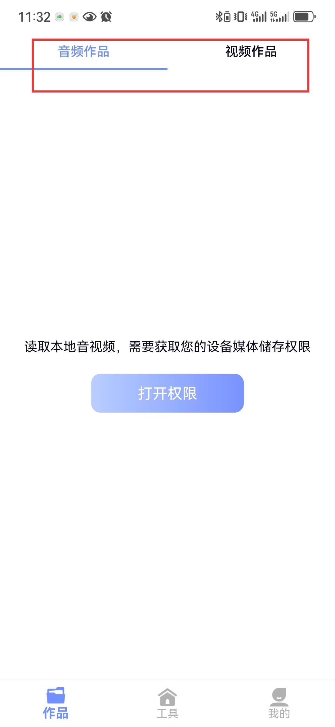 2、切换到作品页面有音频作品、视频作品标签,点击打开权限按系统指引授权,这样APP就能读取手机里的音视频文件,为后续剪辑做准备,方便管理已处理和待处理的作品。