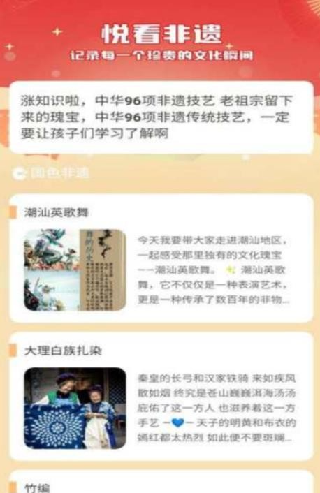 1、在软件中,用户可以浏览和查看各种非物质文化遗产的科普内容。