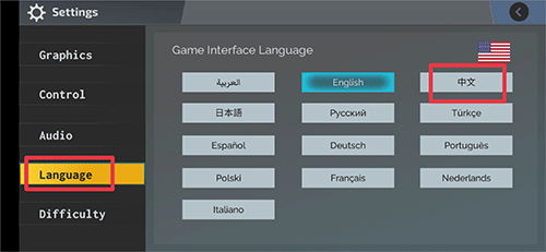 1、打开游戏后,点击设置,在language中可以切换为中文模式。