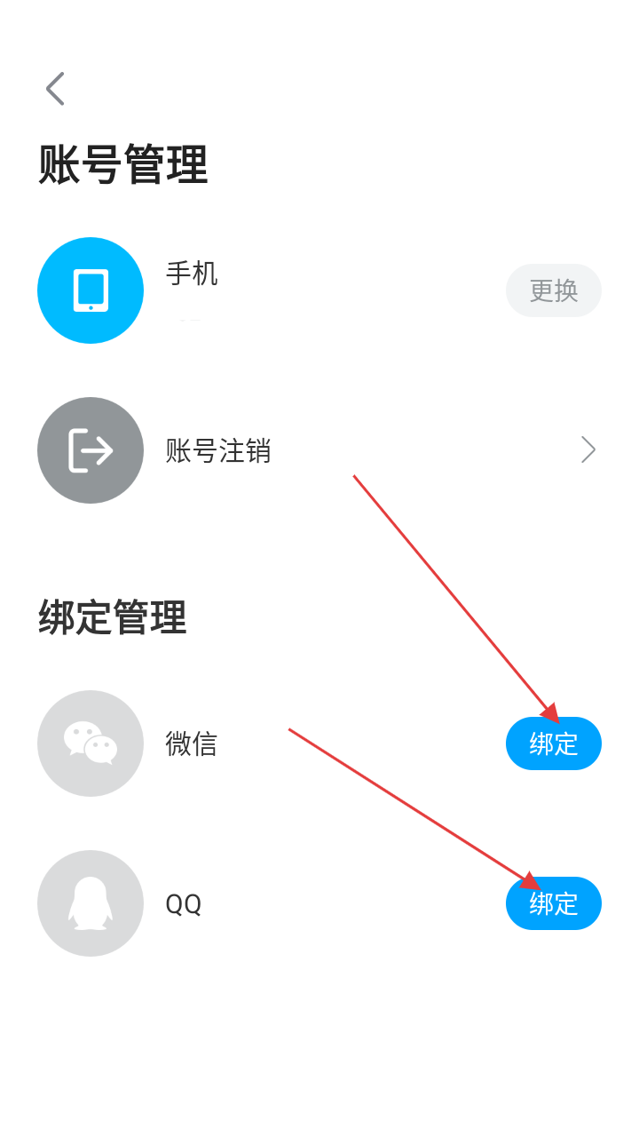 4、在账号管理页面,可进行手机更换、账号注销操作,也能点击【绑定】按钮绑定微信、QQ等账号。