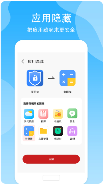 4、应用隐藏 支持手机APP的图标和名称置换,帮助用户快速实现手机APP的隐藏。