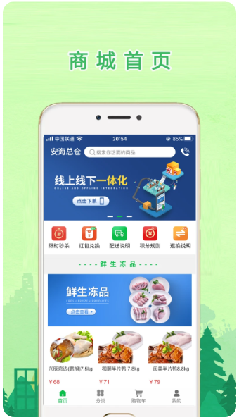 1、大量商品:大量优质生鲜冻品方便用户随时在线购买,满足用户多种需求。