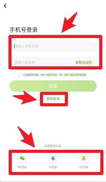 1、登录界面支持手机号验证码、密码方式及第三方微信、QQ登录,满足不同用户的使用需求。