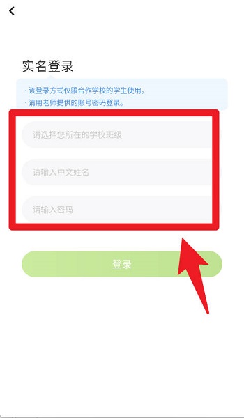 2、实名登录需填写学校班级、中文姓名和密码,适用于合作学校的学生群体。
