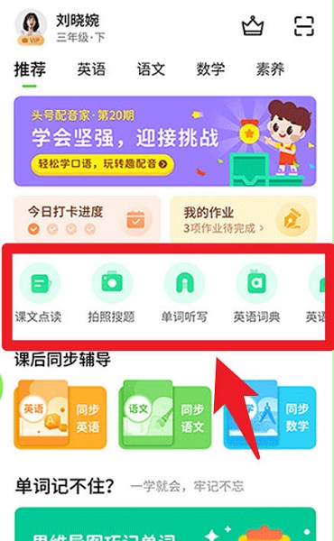 3、首页提供课程点读、拍照搜题、单词听写和英语词典功能,学习工具一应俱全。