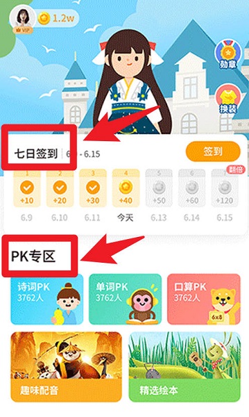 5、任务中心有七日签到和PK专区,参与诗词、单词和口算PK活动,增强趣味性与竞争力。