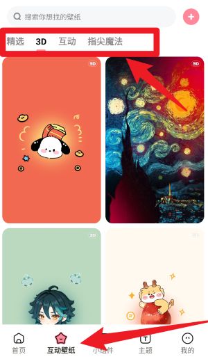 2、在互动壁纸页面,通过顶部分类栏切换精选、3D、互动或指尖魔法等类型,点击任意壁纸即可进入预览与设置界面。