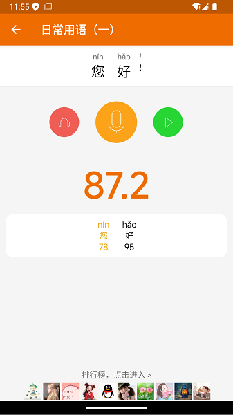 榜: 每句话都有排行榜,听听高手们的发音,大家一起练习吧!