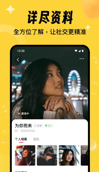 2、个人资料 用户可以编辑个人资料,上传照片和语音介绍等信息,提高他人的理解和认识。