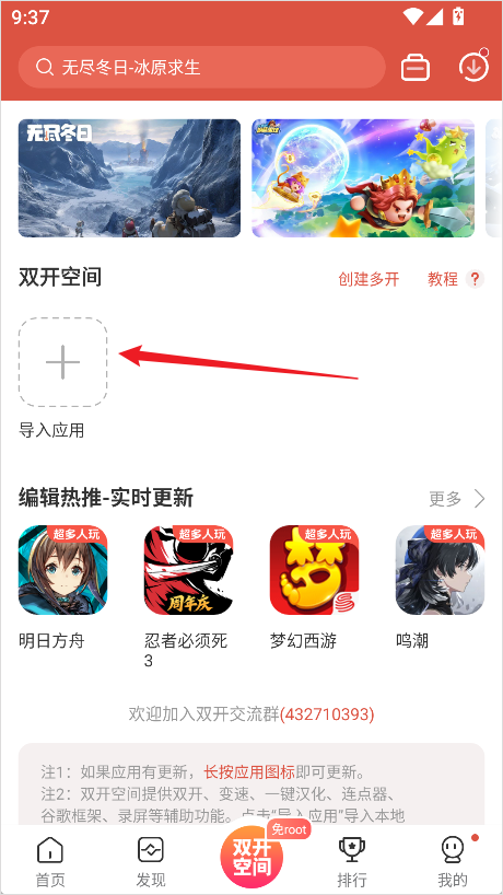 2、点击【导入应用】,从列表中勾选你要双开的游戏或软件。