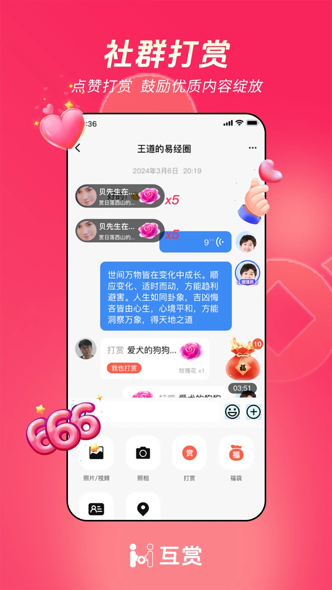 互赏是一款全新的小众圈子软件,拥有全新的动态广场,用户可以轻松选择进入各种广场中交流,还提供丰富多样的帖子和话题,轻松享受便携的服务,能完全满足所有使用需求,还提供多样化的群聊功能,轻松选择各种帖子来评论,给用户带来全面的使用过程,还具有简洁的界面设计,无需任何经验即可上手,方便用户轻松使用各种功能,还加入了智能匹配机制,允许用户在线聊天互动,有需求的用户欢迎来本站下载软件。