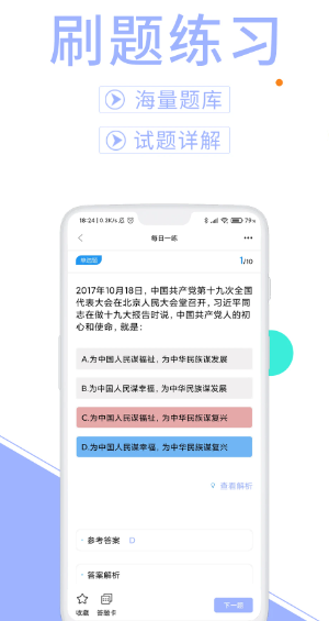 辅警协警考试题库知识范围广,而且可以总结多年来的真题,让用户在线全面进行习题练习。提供的题库类型多样,如模拟考试、随机练习、篇章练习、顺序练习等,满足各种练习需要;根据需求选择题库开始做题,通过做题界面,实时显示正确的答案和分析,还提供了收藏、答题卡等功能;还提供了专门的信息板,可以在线查看各种考试信息,获取最新或热门的行业信息,及时了解相关考试信息和行业动态。