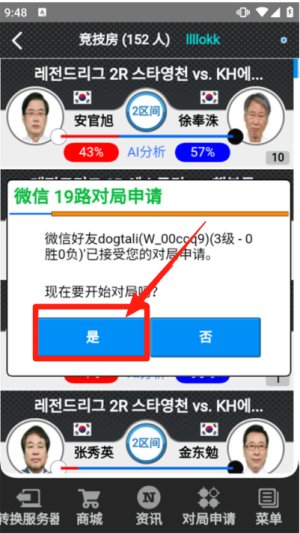 1、在界面中打开对局申请界面,然后选择好友对局,选择对局,观战,观赏棋谱。