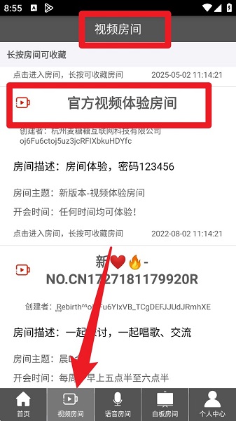 2、切换到「视频房间」页签后,可浏览各类公开会议,点击进入即可参与或体验视频会议。