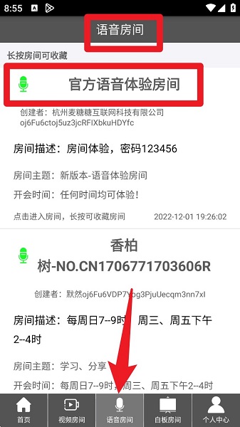 3、在「语音房间」页面中,同样能查看官方及用户创建的语音房间内容,适合语音交流场景。