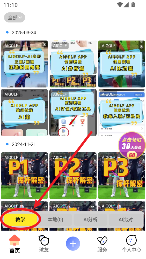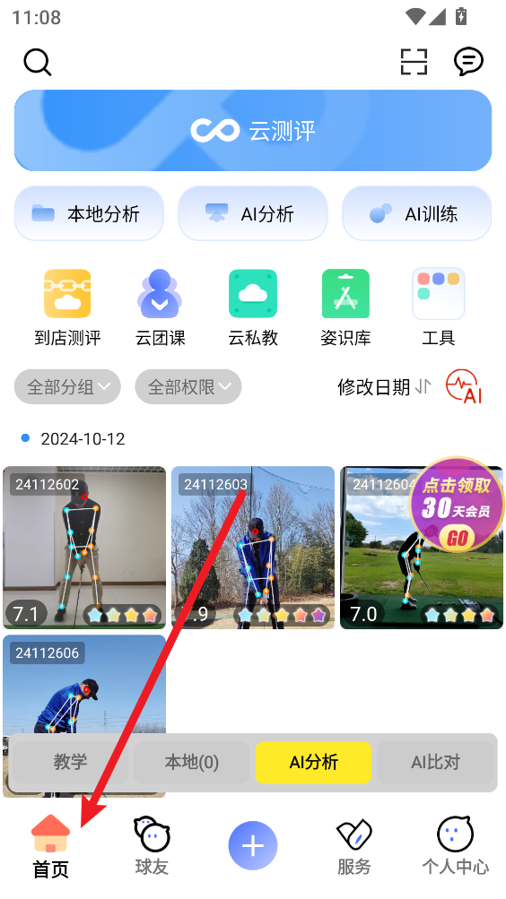 2、登录成功后点击底部“首页”查看挥杆分析和相关打点记录内容。